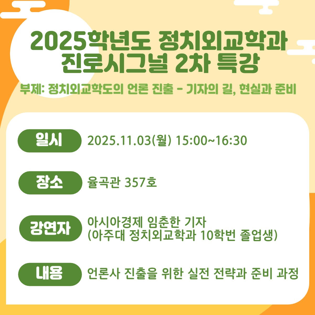 - 행사명: 2025학년도 정치외교학과 진로시그널 특강 (2차)